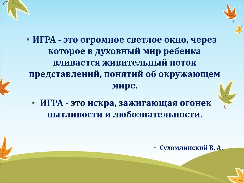 • ИГРА - это огромное светлое окно, черезкоторое в духовный мир ребенка