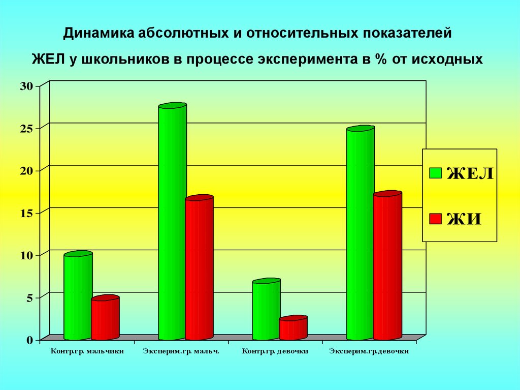 Динамика абсолютных и относительных показателейЖЕЛ у школьников в процессе эксперимента в % от исходных