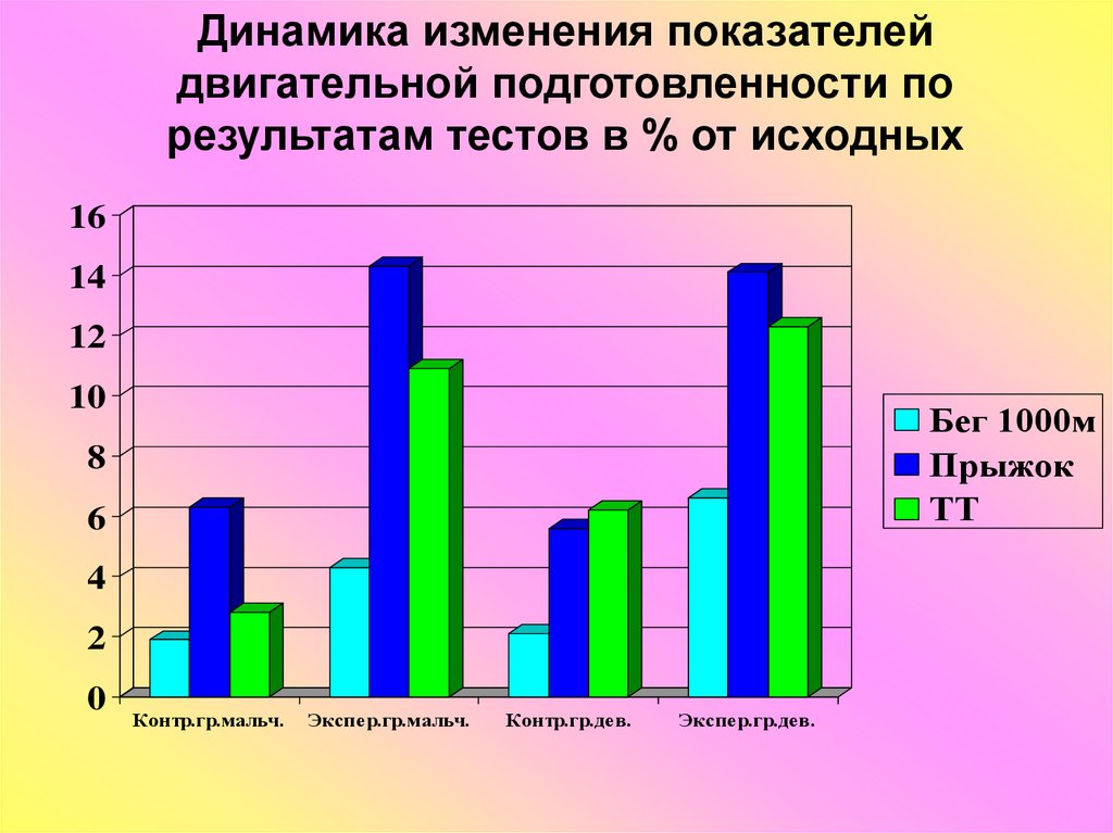 Динамика изменения показателей двигательнойподготовленности у школьников в % от исходных по
