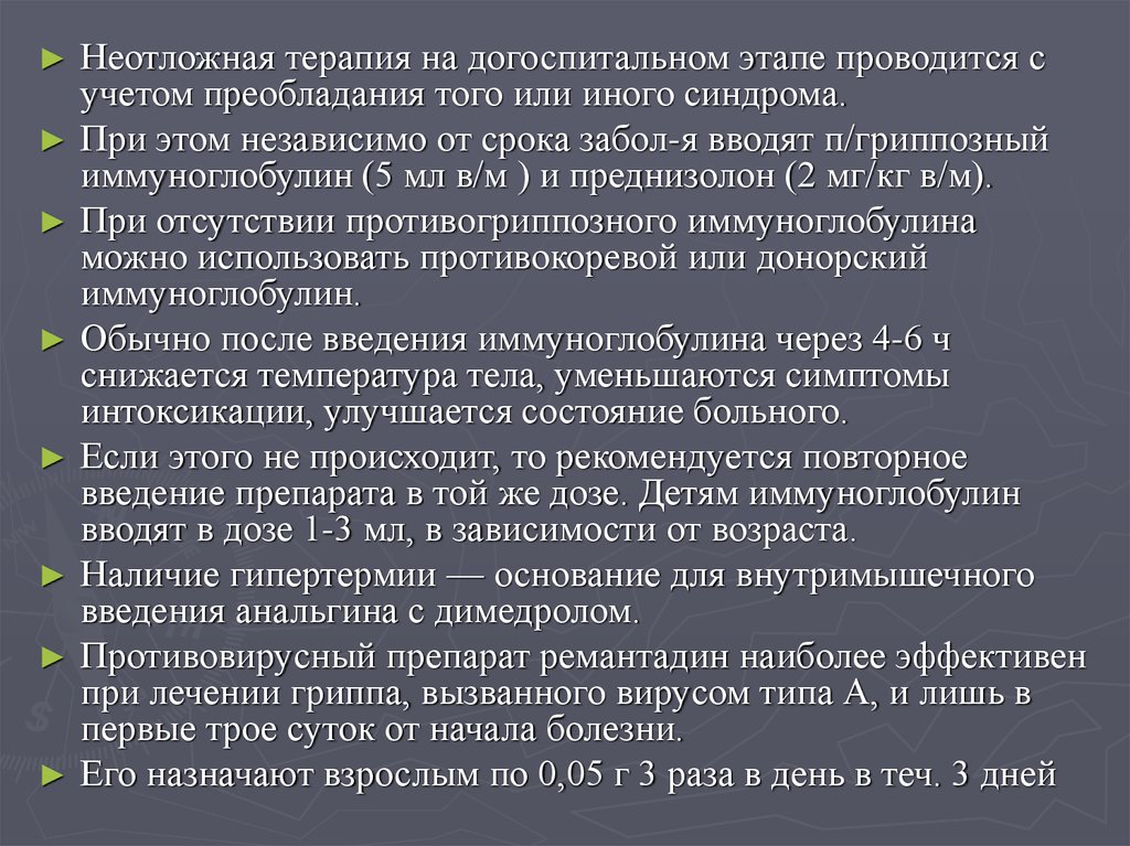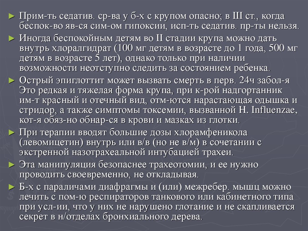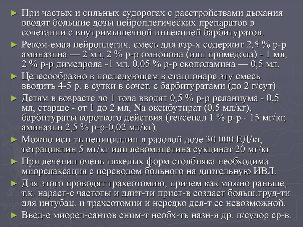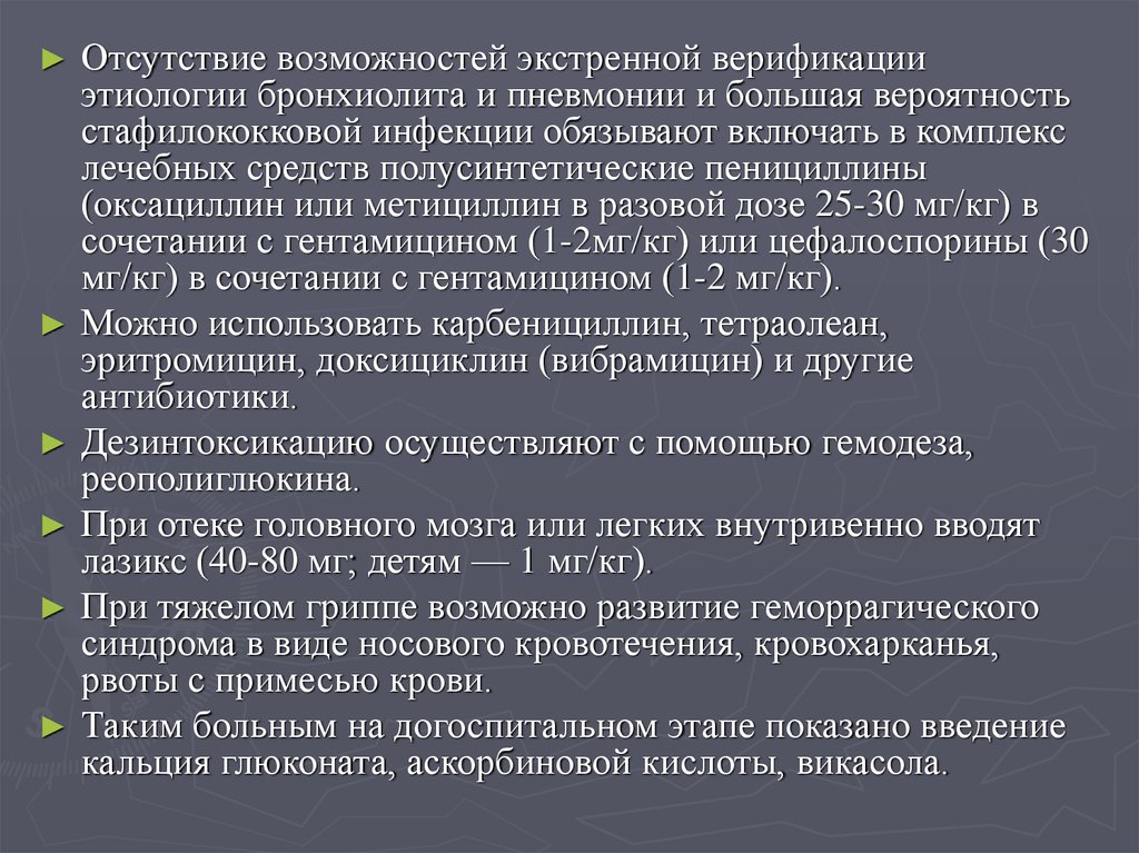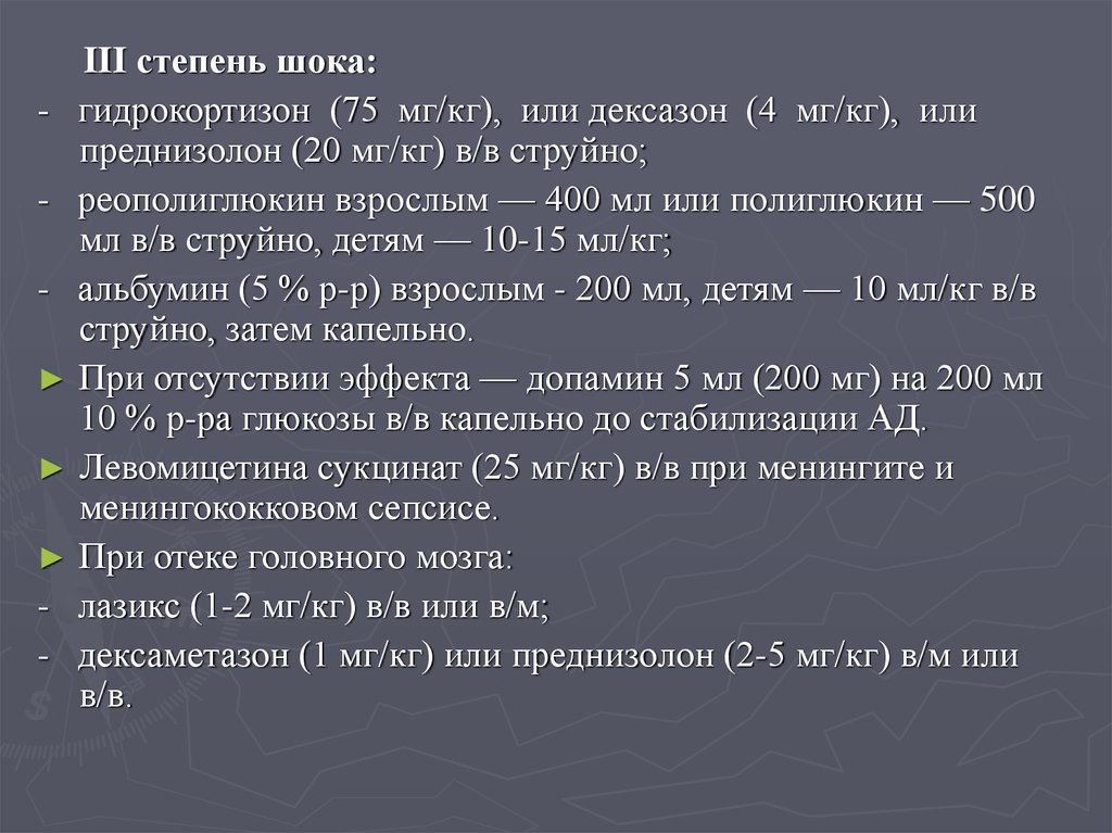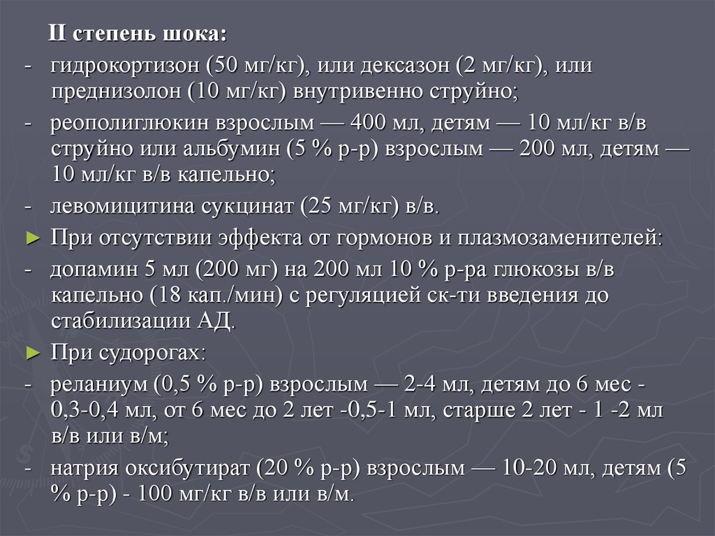 преднизолона, 60-80 мг 1 % р-ра лазикса (реб-ку - 0,1 мл/кг), 5 мл 0,25 % р-ра дроперидола в/в или в/м (реб-ку — 0,1 мл/кг)