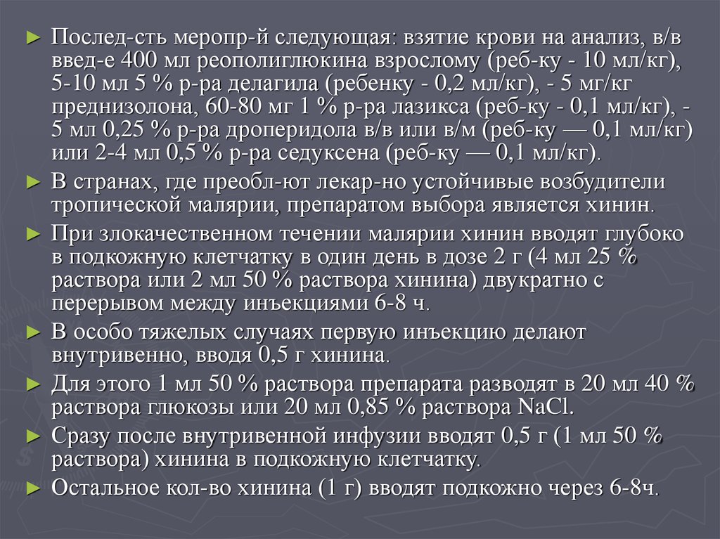 Остальное кол-во хинина (1 г) вводят подкожно через 6-8ч.