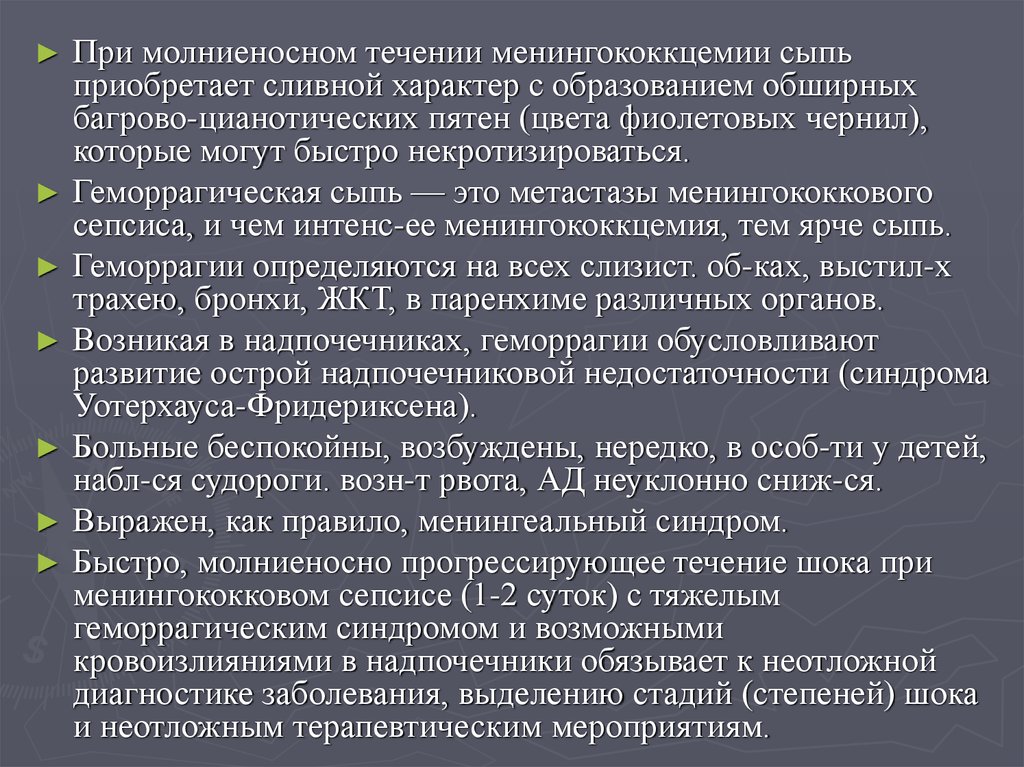Менингококковый сепсис харак-ся чрезвычайно быстро