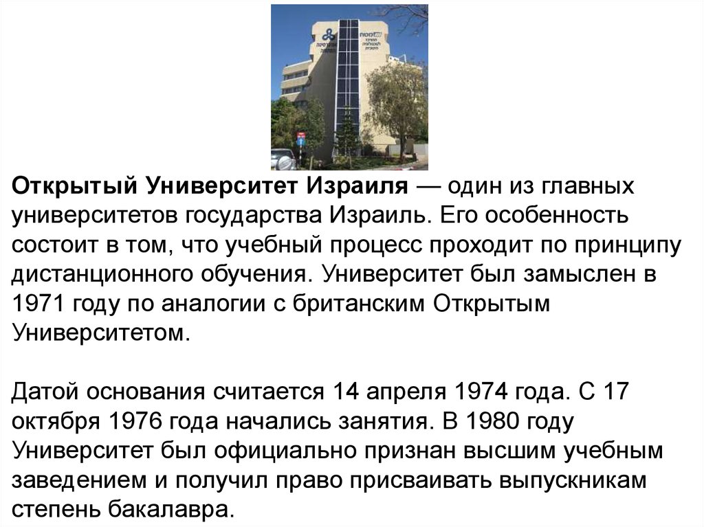 Открытый Университет Израиля — один из главныхуниверситетов государства Израиль. Его особенность