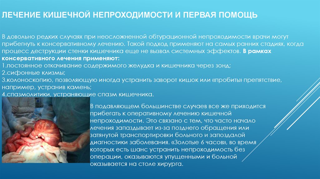 ЛЕЧЕНИЕ КИШЕЧНОЙ НЕПРОХОДИМОСТИ И ПЕРВАЯ ПОМОЩЬВ довольно редких случаях при неосложненной обтурационной непроходимости врачи могут