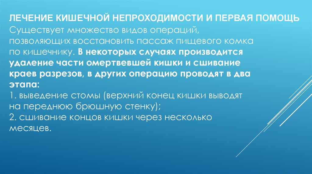ЛЕЧЕНИЕ КИШЕЧНОЙ НЕПРОХОДИМОСТИ И ПЕРВАЯ ПОМОЩЬСуществует множество видов операций,