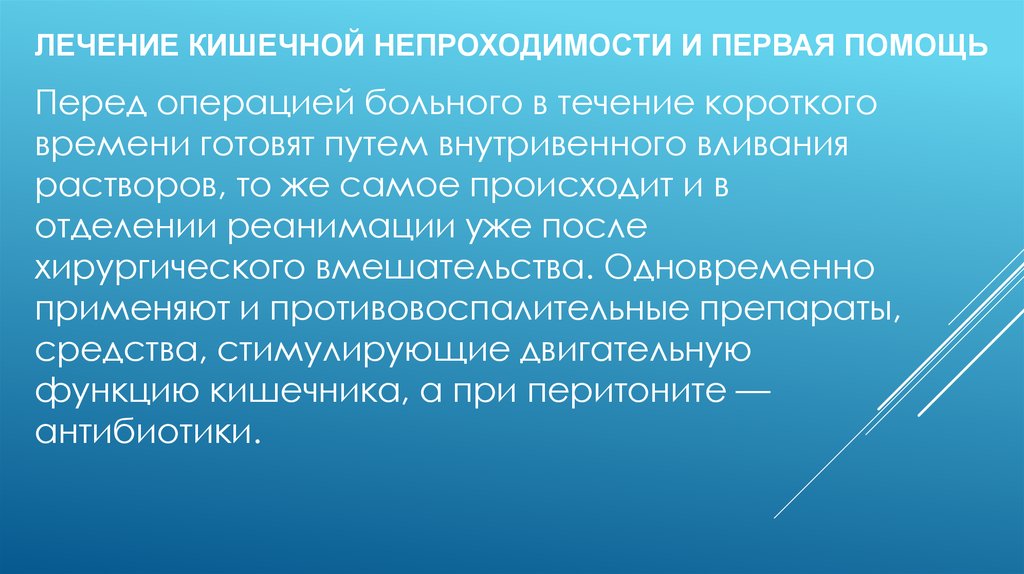 ЛЕЧЕНИЕ КИШЕЧНОЙ НЕПРОХОДИМОСТИ И ПЕРВАЯ ПОМОЩЬПеред операцией больного в течение короткого