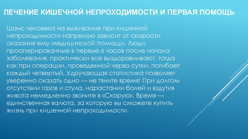 ЛЕЧЕНИЕ КИШЕЧНОЙ НЕПРОХОДИМОСТИ И ПЕРВАЯ ПОМОЩЬШанс человека на выживание при кишечной