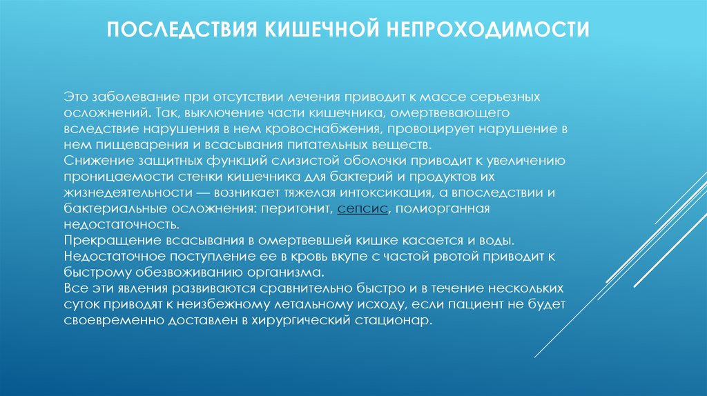 ПОСЛЕДСТВИЯ КИШЕЧНОЙ НЕПРОХОДИМОСТИЭто заболевание при отсутствии лечения приводит к массе серьезных