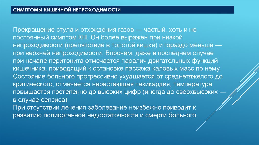 СИМПТОМЫ КИШЕЧНОЙ НЕПРОХОДИМОСТИПрекращение стула и отхождения газов — частый, хоть и не