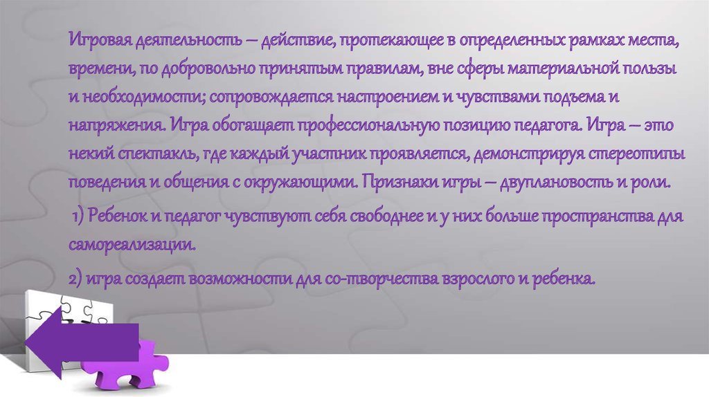 напряжения. Игра обогащает профессиональную позицию педагога. Игра – это