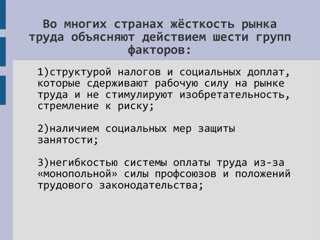 Во многих странах жёсткость рынкатруда объясняют действием шести групп