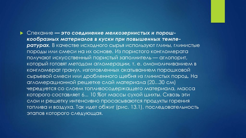 Спекание — это соединение мелкозернистых и порошкообразных материалов в куски при повышенных температурах. В качестве исходного сырья используют глины, глинистыепороды или смеси на их основе. Из пористого конгломерата