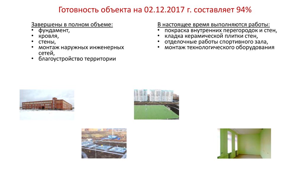 Готовность объекта на 02.12.2017 г. составляет 94%Завершены в полном объеме: