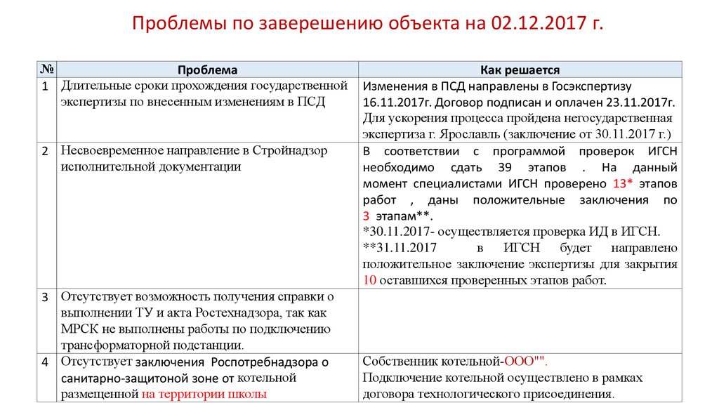 Проблемы по заверешению объекта на 02.12.2017 г.№