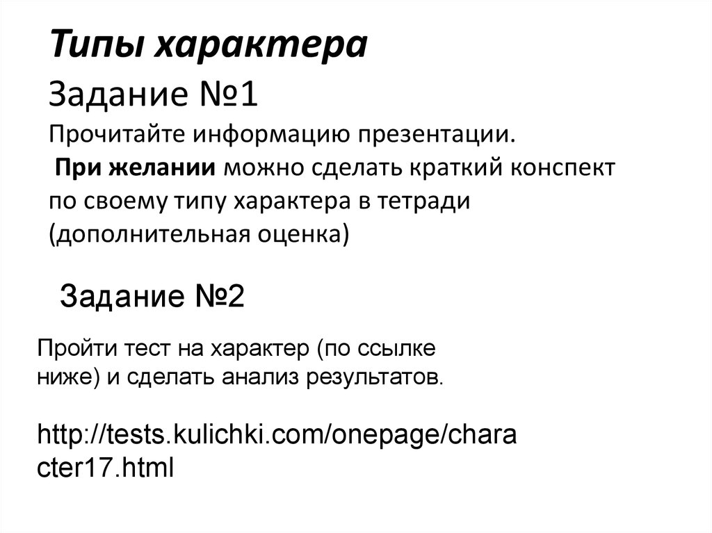 1. Типы характера Задание №1 Прочитайте информацию презентации. При желании можно сделать краткий конспект по своему типу
