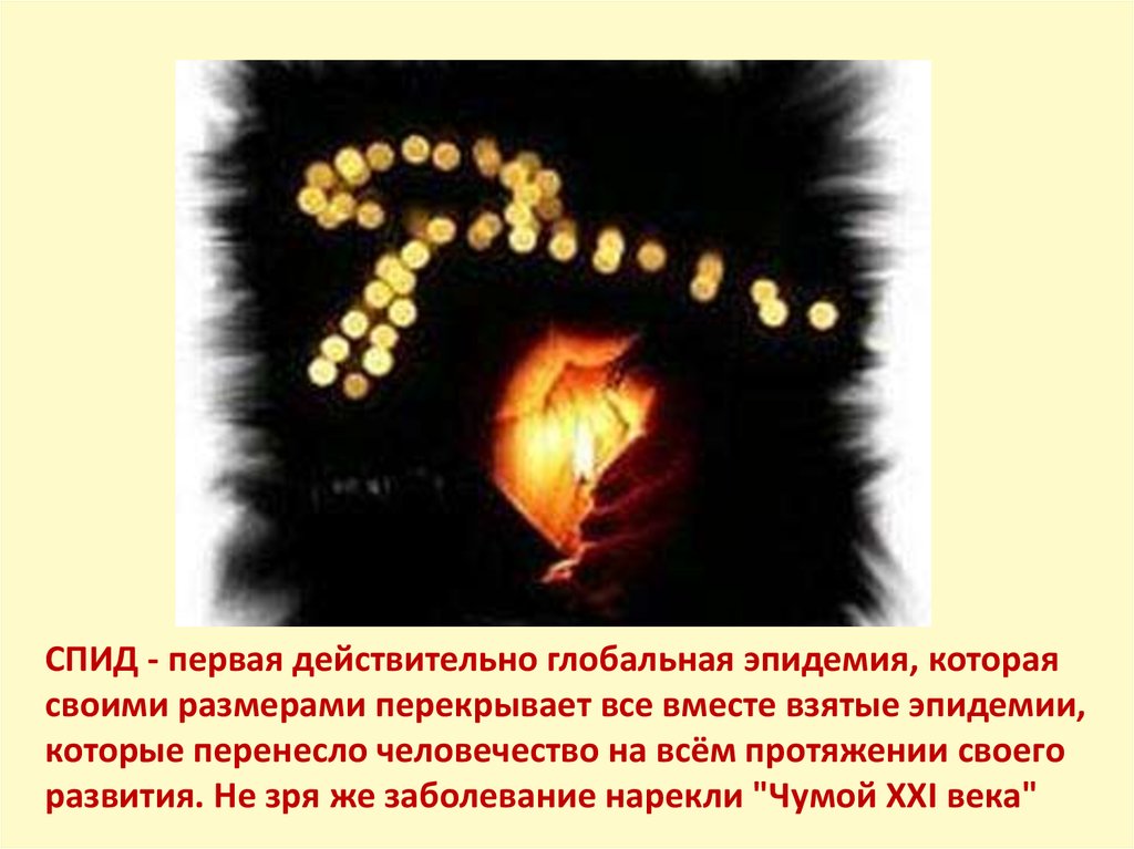 СПИД - первая действительно глобальная эпидемия, котораясвоими размерами перекрывает все вместе взятые эпидемии,