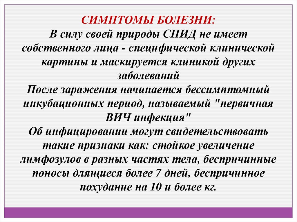 СИМПТОМЫ БОЛЕЗНИ:В силу своей природы СПИД не имеет