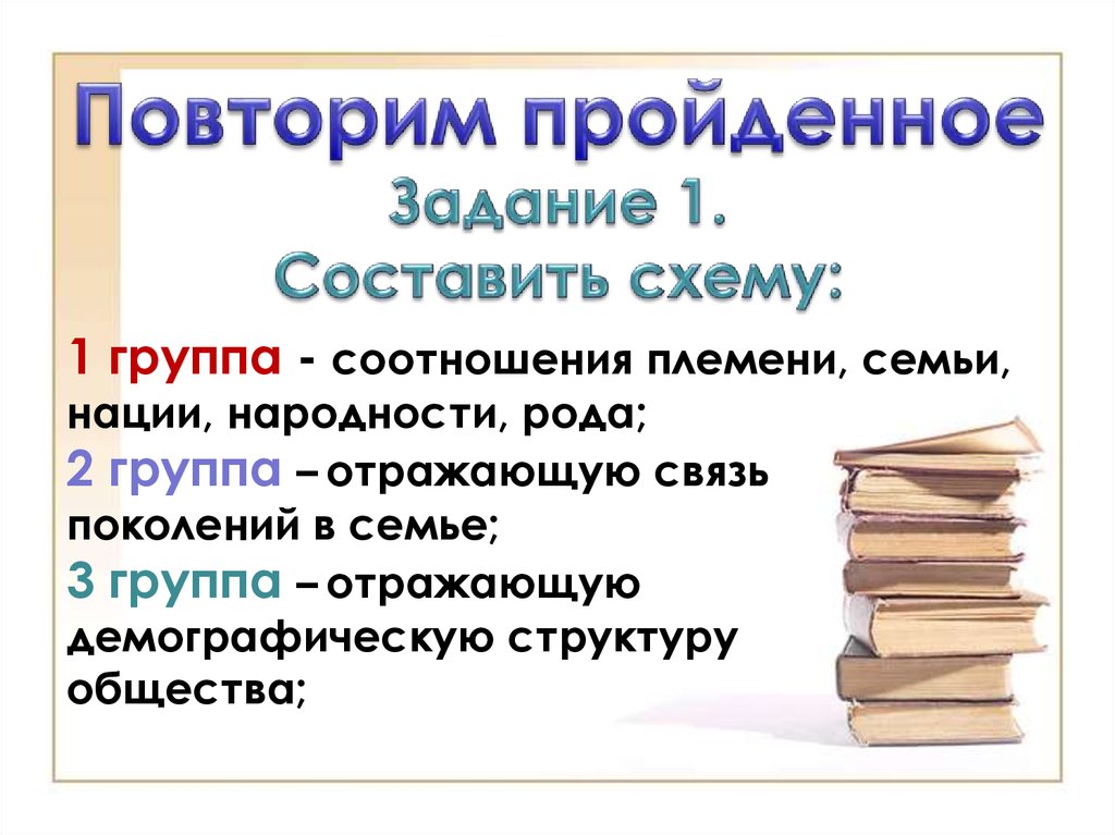 1 группа - соотношения племени, семьи,нации, народности, рода;