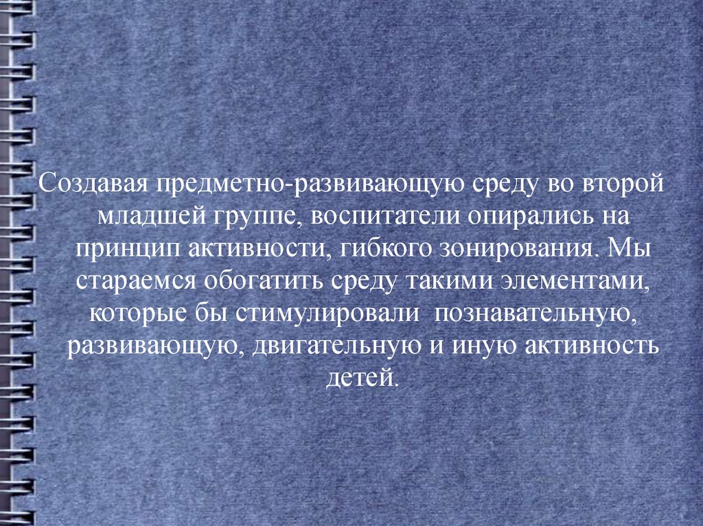 Создавая предметно-развивающую среду во второймладшей группе, воспитатели опирались на