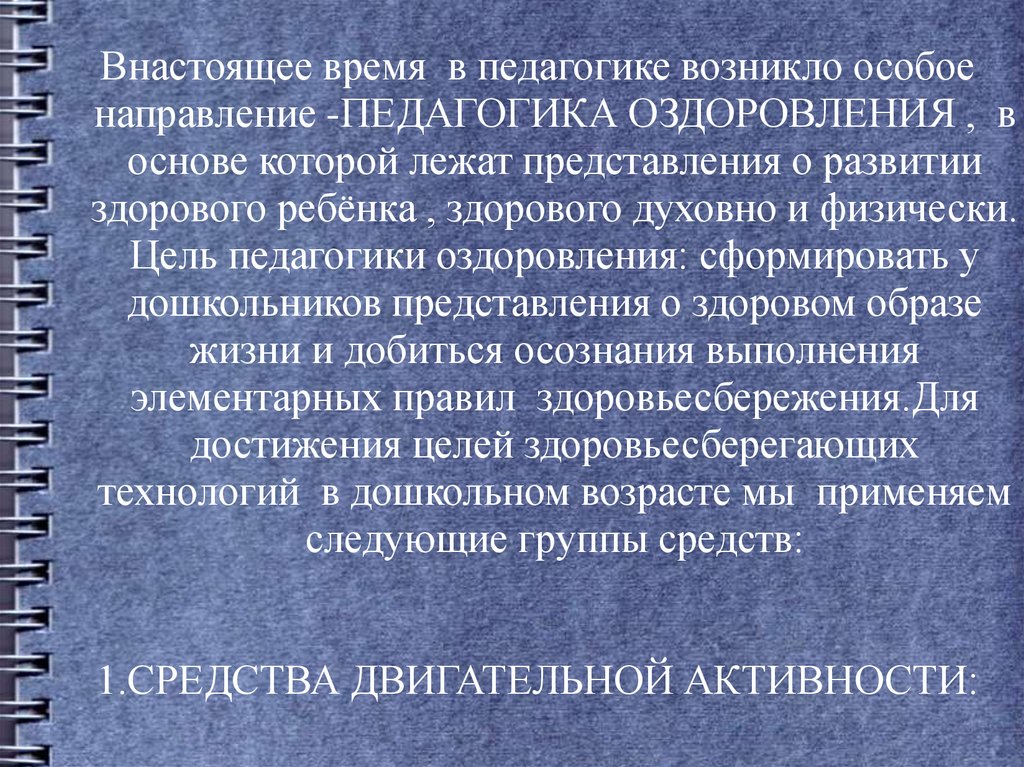 Внастоящее время в педагогике возникло особоенаправление -ПЕДАГОГИКА ОЗДОРОВЛЕНИЯ , в