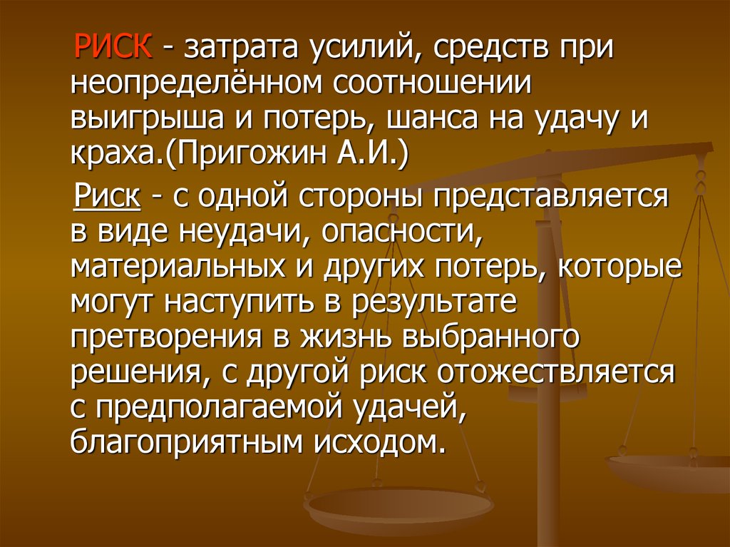 РИСК - затрата усилий, средств принеопределённом соотношении