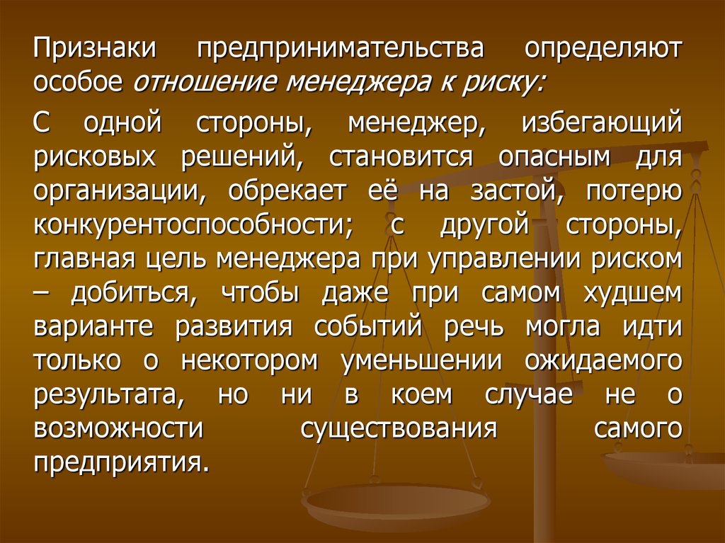 Признаки предпринимательства определяютособое отношение менеджера к риску: