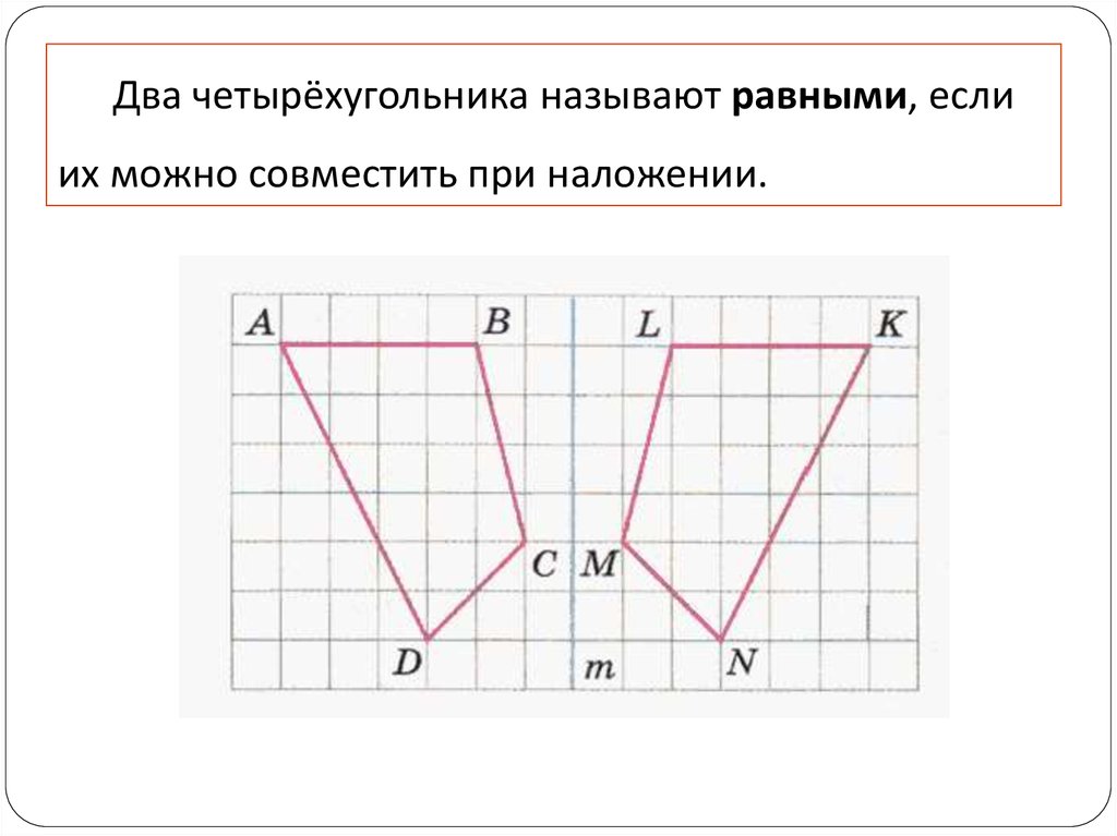 Два четырёхугольника называют равными, еслиих можно совместить при наложении.