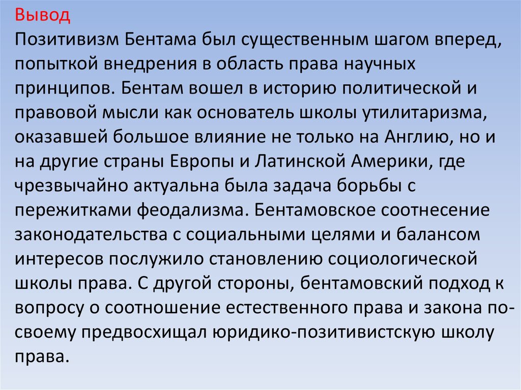 ВыводПозитивизм Бентама был существенным шагом вперед,