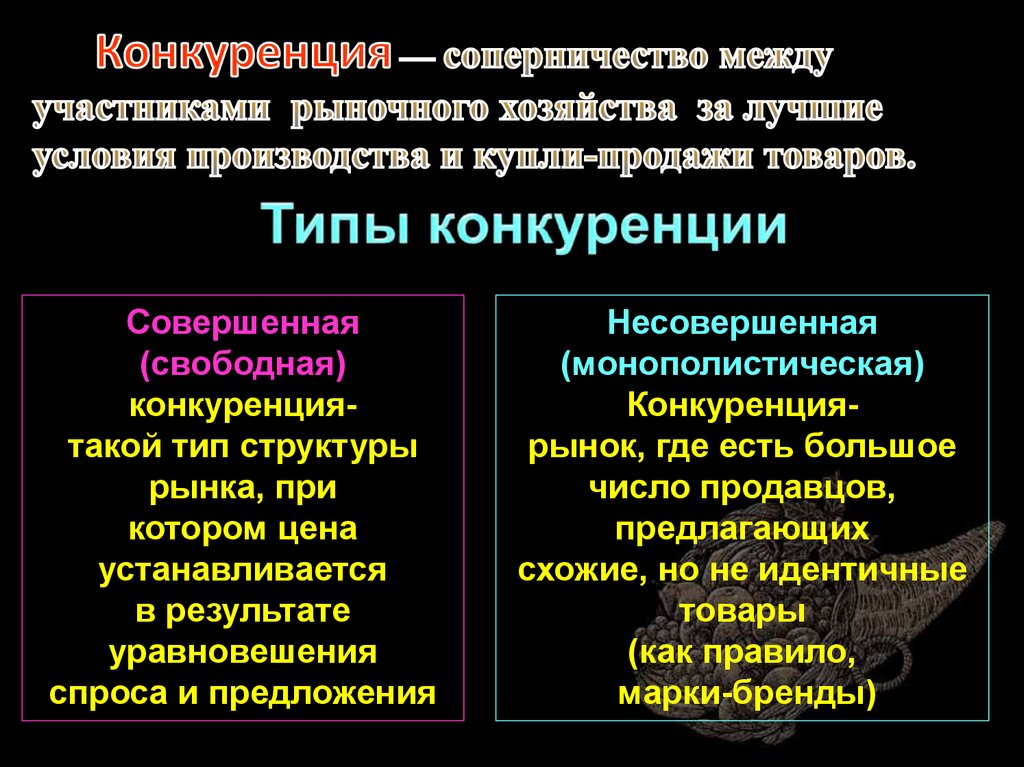Конкуренция — соперничество между участниками рыночного хозяйства за лучшие условия производства и купли-продажи товаров.Совершенная