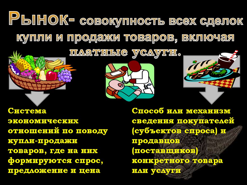 Система экономических отношений по поводу купли-продажи товаров, где на них формируются спрос, предложение и ценаСпособ или механизм сведения покупателей (субъектов спроса) и продавцов (поставщиков) конкретного товара или услуги