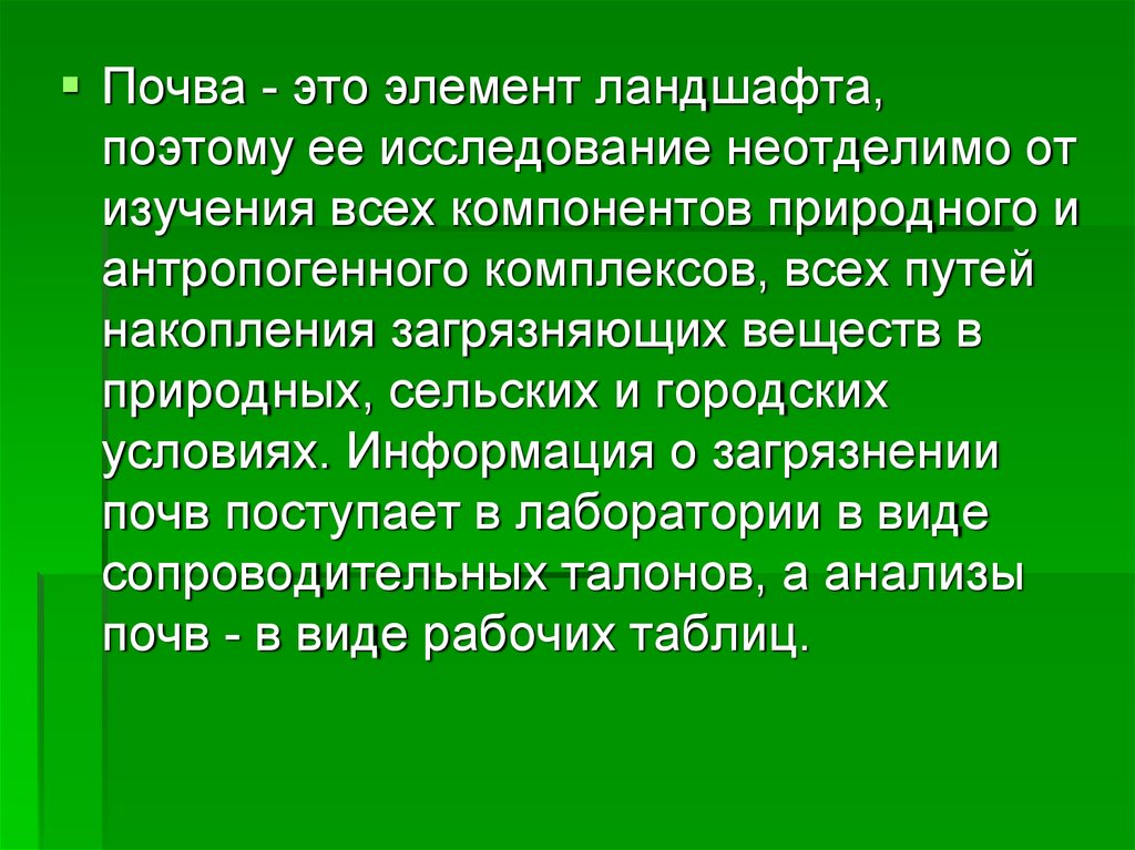 Почва - это элемент ландшафта,поэтому ее исследование неотделимо от