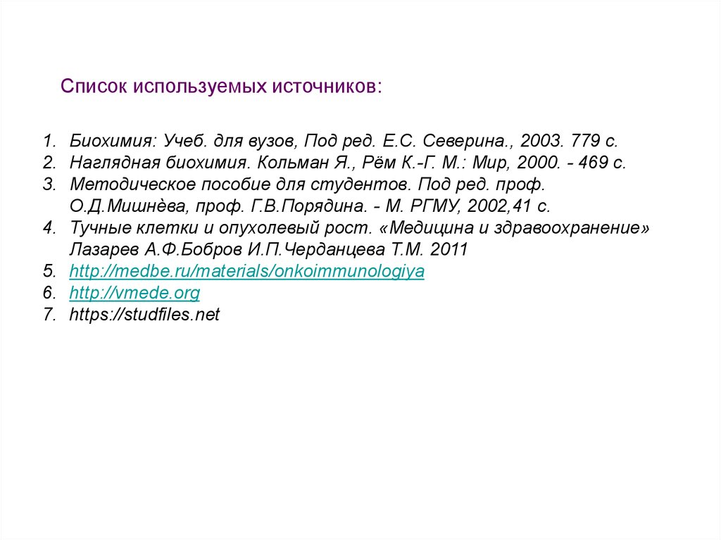 Список используемых источников:1. Биохимия: Учеб. для вузов, Под ред. Е.С. Северина., 2003. 779 с.