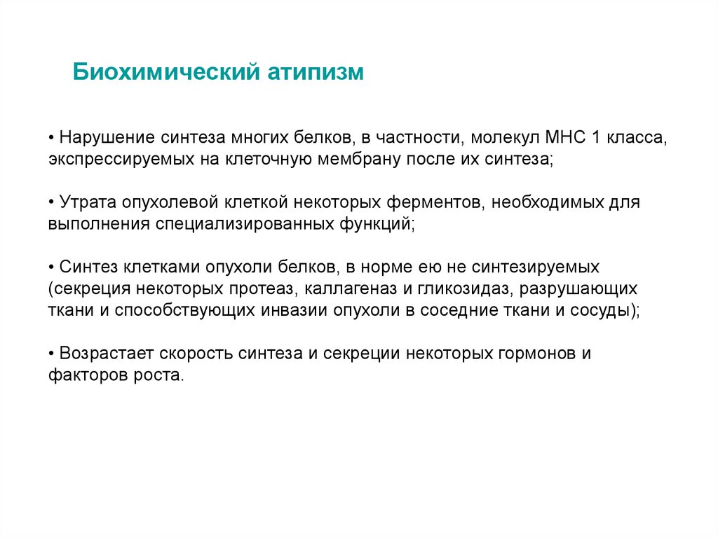 Биохимический атипизм• Нарушение синтеза многих белков, в частности, молекул МНС 1 класса,