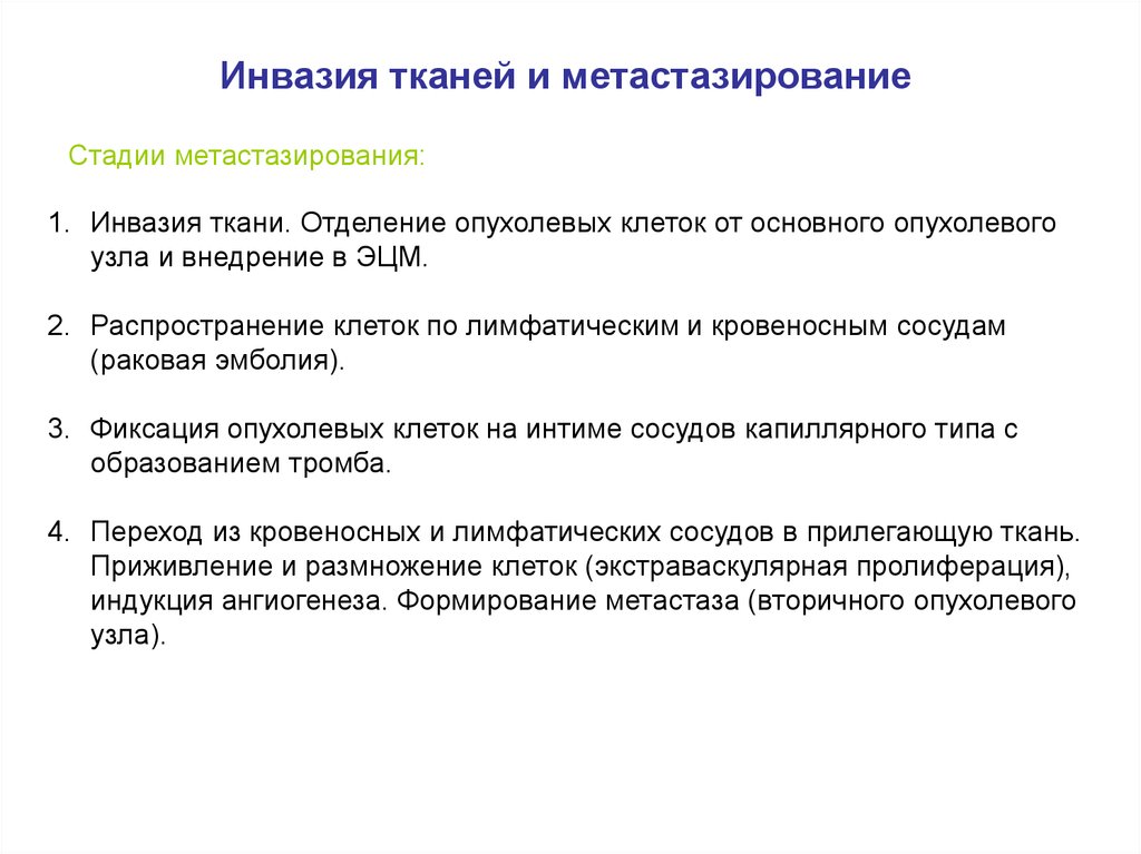 Инвазия тканей и метастазированиеСтадии метастазирования: