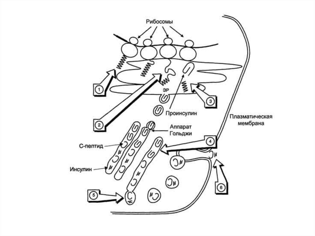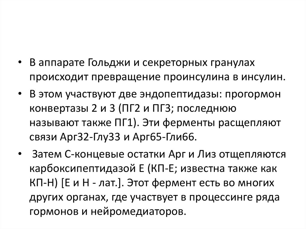 • В аппарате Гольджи и секреторных гранулахпроисходит превращение проинсулина в инсулин.