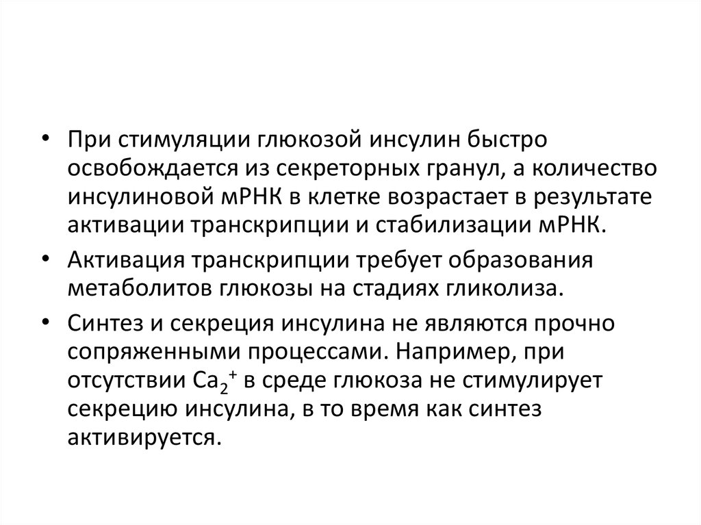 • При стимуляции глюкозой инсулин быстроосвобождается из секреторных гранул, а количество