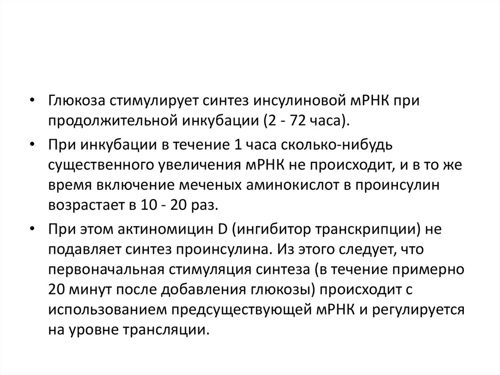 • Глюкоза стимулирует синтез инсулиновой мРНК припродолжительной инкубации (2 - 72 часа).