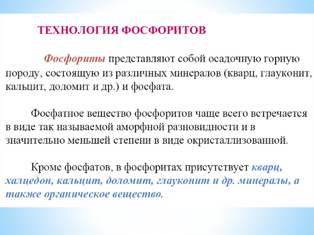 * фторапатит (Са10Р6О24F), с теоретическимсодержанием Р2О5 – 42,23%, СаО – 55,64 %, F