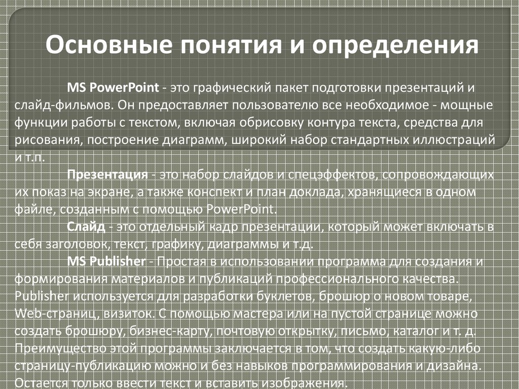 Основные понятия и определенияMS PowerPoint - это графический пакет подготовки презентаций и