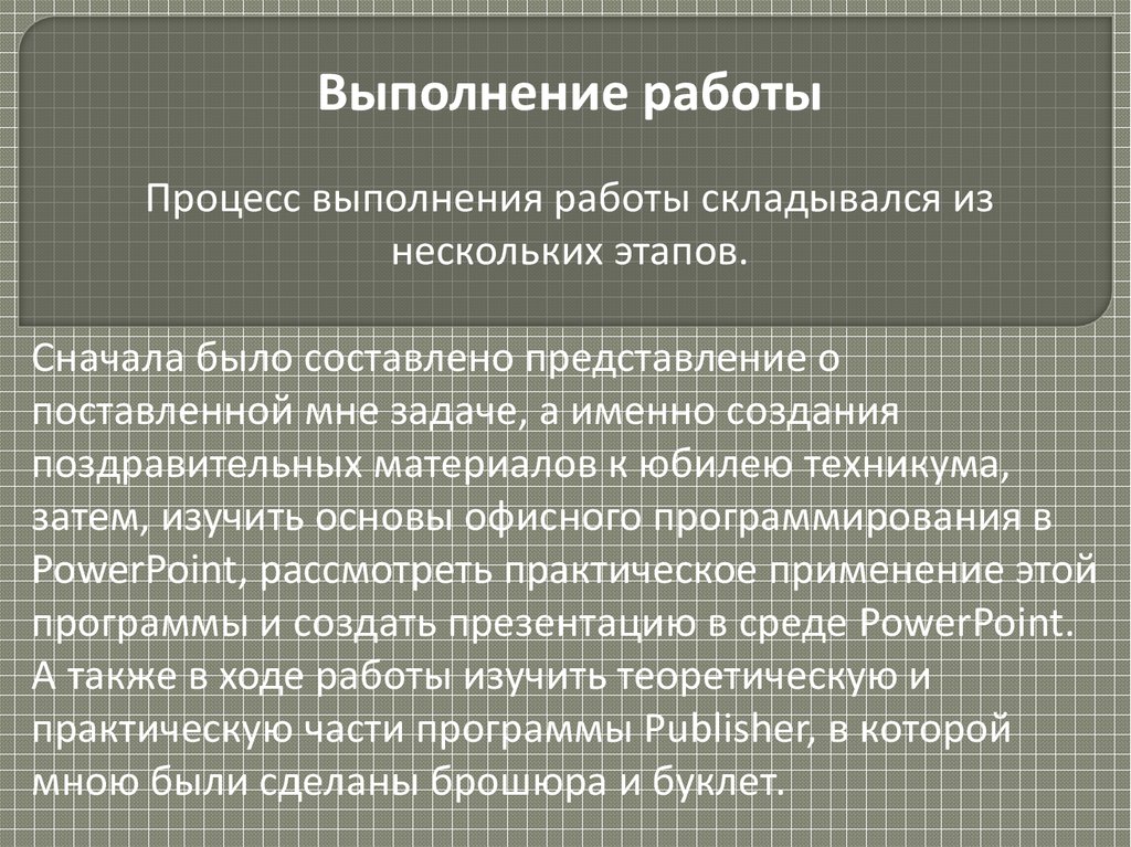 Выполнение работыПроцесс выполнения работы складывался из