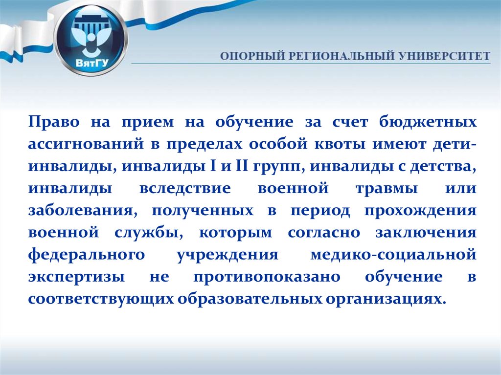 Право на прием на обучение за счет бюджетныхассигнований в пределах особой квоты имеют детиинвалиды, инвалиды I и II групп, инвалиды с детства,