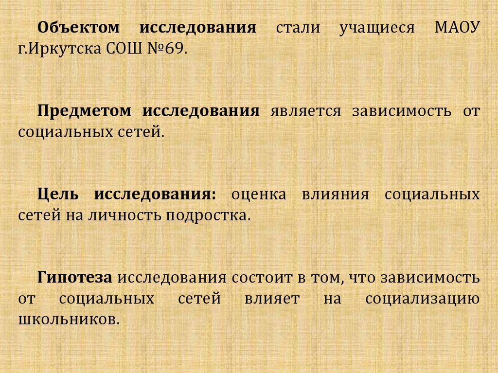 Объектом исследованияг.Иркутска СОШ №69.