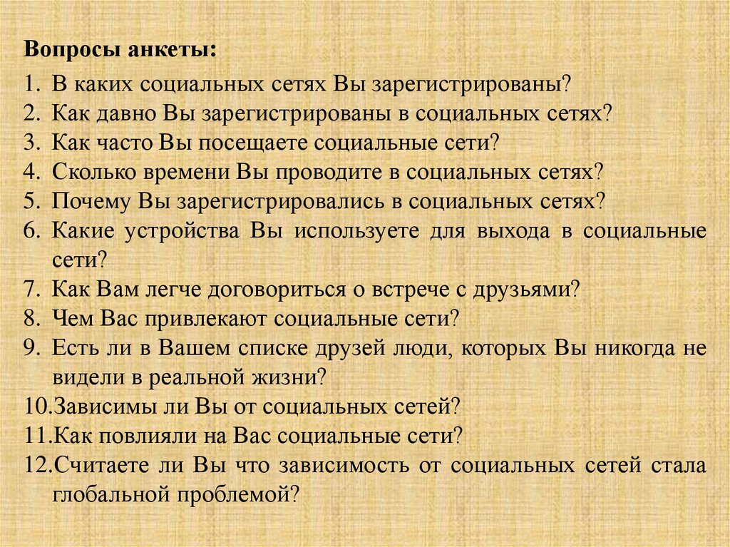 Вопросы анкеты:1. В каких социальных сетях Вы зарегистрированы?