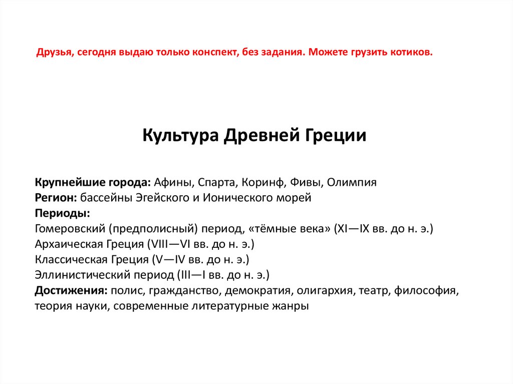Друзья, сегодня выдаю только конспект, без задания. Можете грузить котиков.Культура Древней Греции