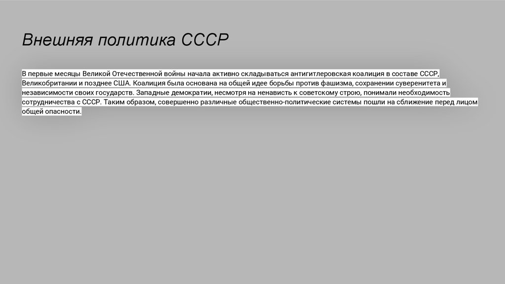Внешняя политика СССРВ первые месяцы Великой Отечественной войны начала активно складываться антигитлеровская коалиция в составе СССР,