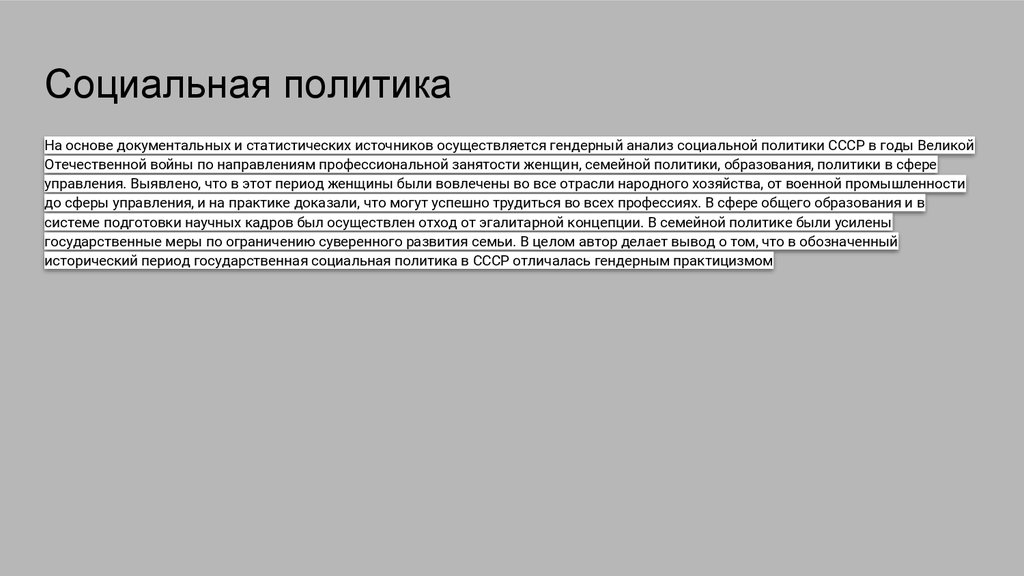 Социальная политикаНа основе документальных и статистических источников осуществляется гендерный анализ социальной политики СССР в годы Великой