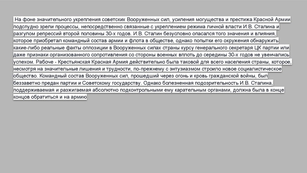 На фоне значительного укрепления советских Вооруженных сил, усиления могущества и престижа Красной Армииподспудно зрели процессы, непосредственно связанные с укреплением режима личной власти И.В. Сталина и