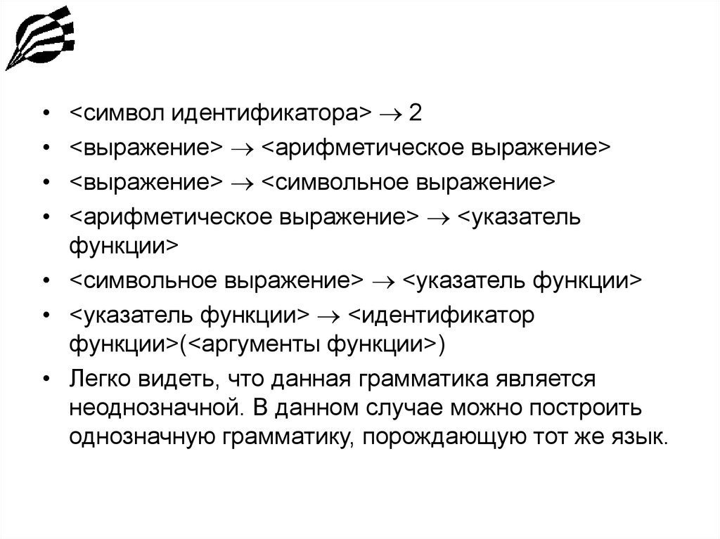 • Здесь очевидно грамматика является однозначной.