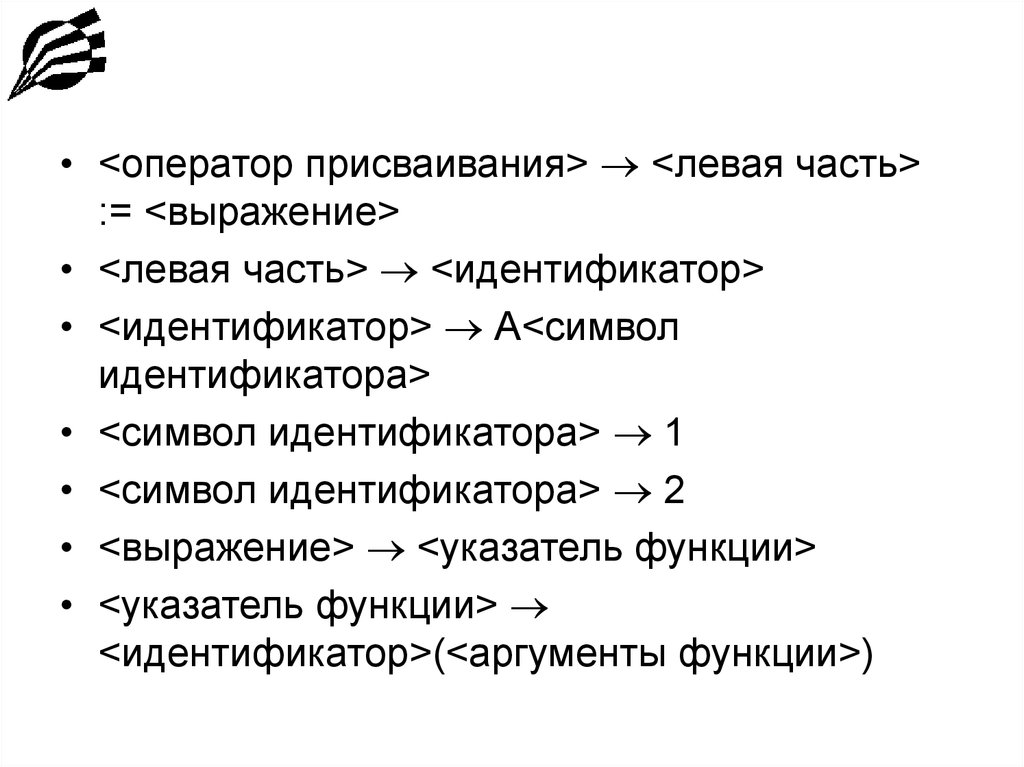 • <оператор присваивания> <левая часть>:= <выражение>