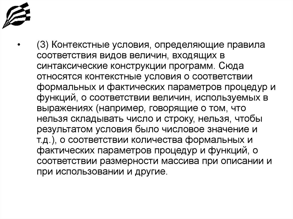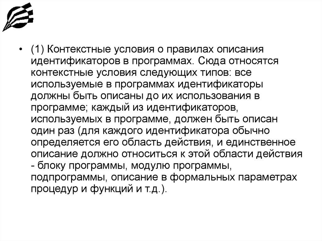 • (1) Контекстные условия о правилах описанияидентификаторов в программах. Сюда относятся